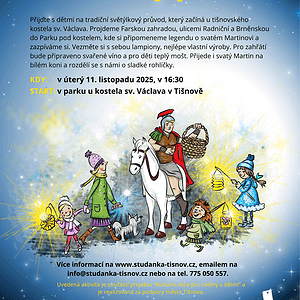 Přijďte s dětmi na tradiční světýlkový průvod, který začíná u kostela sv. Václava. Projdeme Farskou zahradou, ulicí Radniční a Brněnskou do Parku pod kostelem, kde si připomeneme legendu o svatém... číst více
