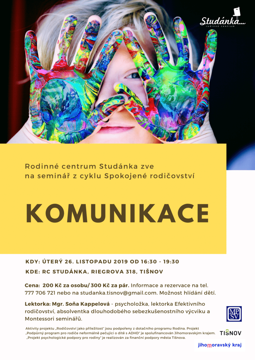 Seminář z cyklu Spokojené rodičovství zaměřený na téma komunikace – jak dítěti naslouchat, abychom mu rozuměli, jak s dětmi hovořit, aby nám naslouchaly, jak motivovat děti ke spolupráci.