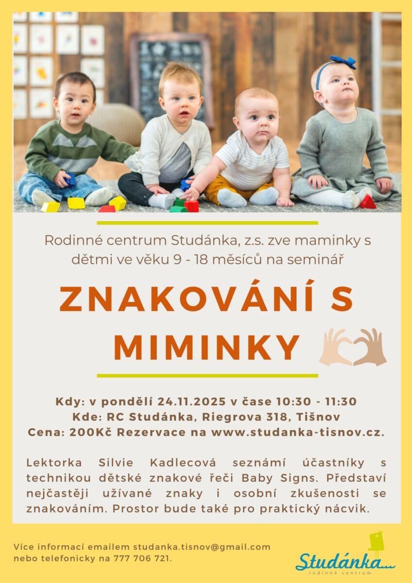 Lektorka Silvie Kadlecová seznámí účastníky s technikou dětské znakové řeči Baby Signs. Představí nejčastěji užívané znaky i své osobní zkušenosti se znakováním. Prostor bude také pro praktický nácvik.